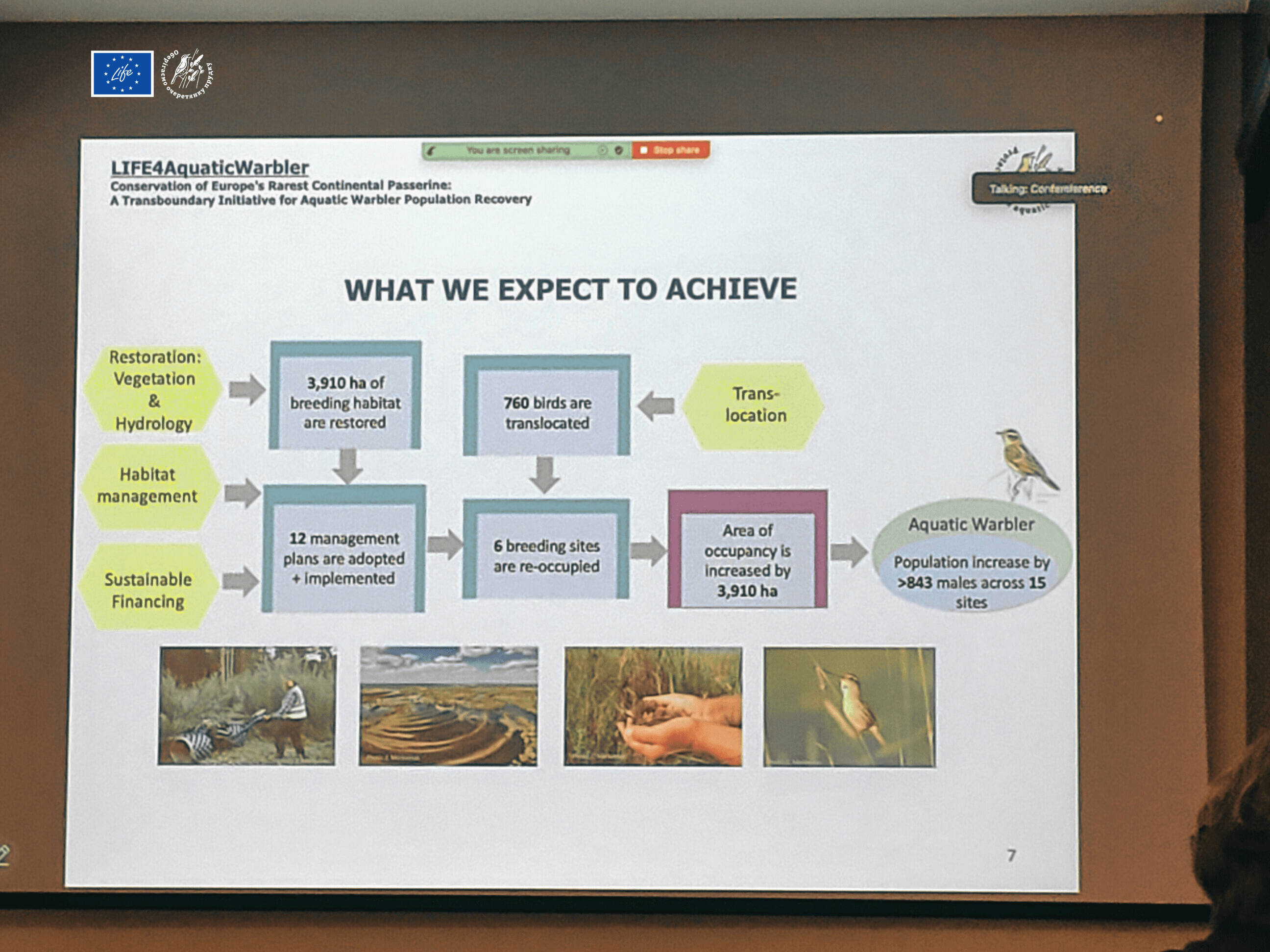 Програма конференції охоплювала ключові аспекти охорони очеретянки прудкої: глобальний стан популяцій та ключові загрози (сучасні тенденції чисельності; прогалини у обізнаності про вид; вплив зміни клімату на болотно-лукові екосистеми), основні міжнародні ініціативи та результати попередніх проєктів зі збереження виду: досягнення 10-річної реалізації проекту LIFE MagniDucatusAcrola; нові результати LIFE AWOM щодо охорони міграційних та територій зимівлі очеретянки прудкої; перші напрацювання проєкту LIFE4AquaticWarbler у країнах гніздування. Однією з важливих тем стало обговорення транслокації пташенят як методу збереження виду та відновлення популяції на територіях гніздування в минулому - відновлених осокових торфовищах.