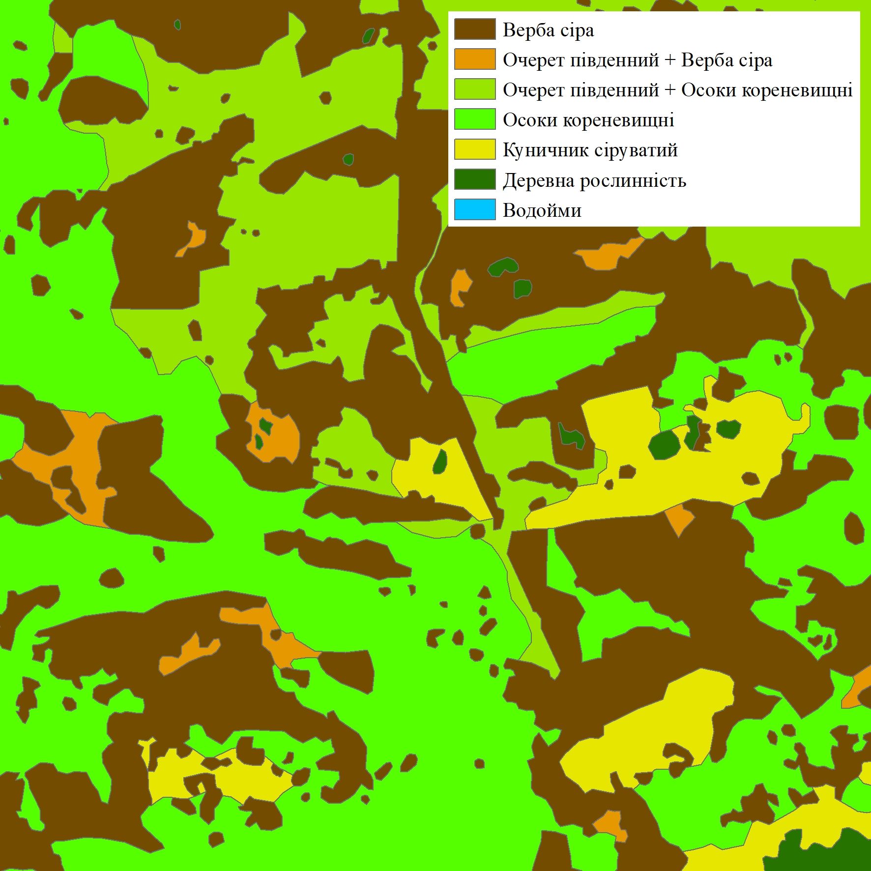Нова карта демонструє сучасні межі рослинних угрупувань (фітоценозів) на нашій проєктній території за домінантною ознакою, тобто класифікацією за переважаючим видом рослини.
